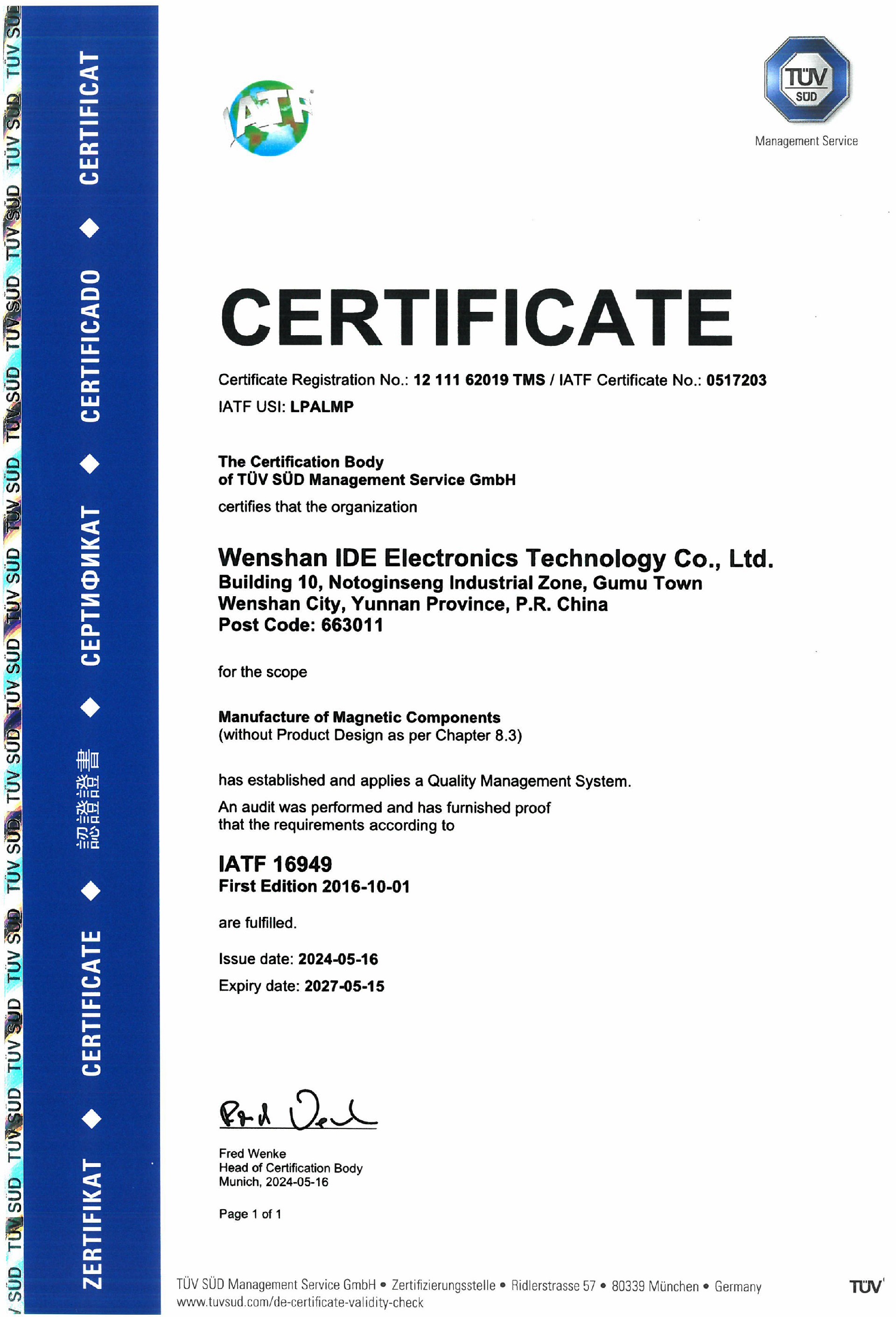 IATF 16949質(zhì)量管理體系證書-英文版                                   IATF 16949質(zhì)量管理體系證書-中文版